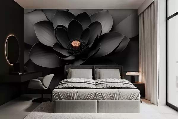 Fototapeten Minimalistische schwarze Blume mit Blütenblättern und einem kontrastierenden, warmen Blütenkern N° w09721