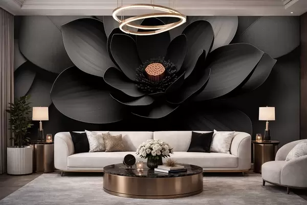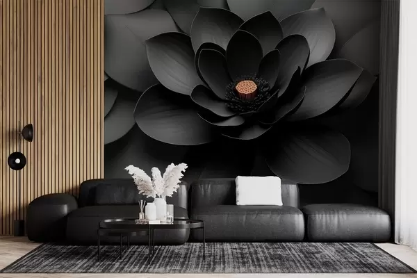 Fototapeten Minimalistische schwarze Blume mit Blütenblättern und einem kontrastierenden, warmen Blütenkern N° w09721