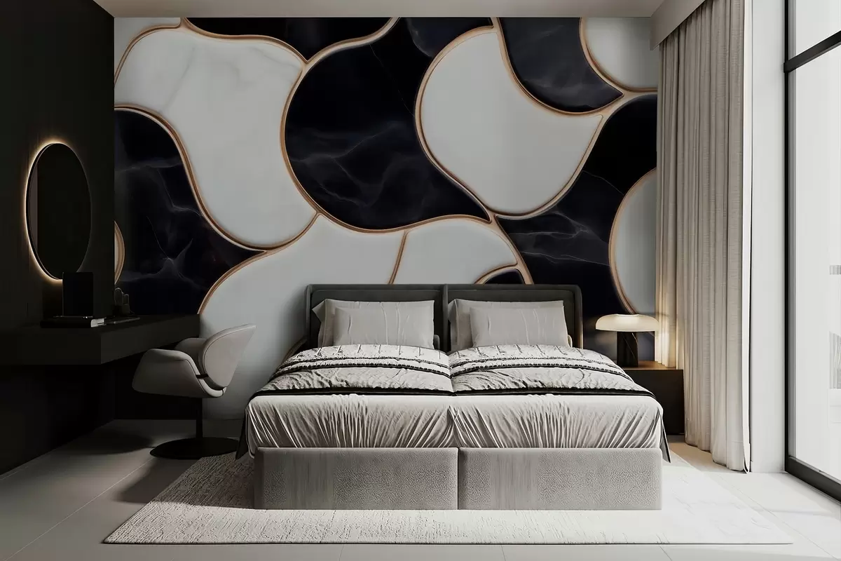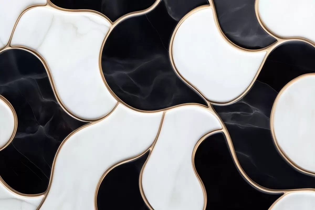 Fototapeten Abstrakte Nachahmung einer Marmorkomposition in Schwarz- und Weißtönen mit gelben Linien N° w09733