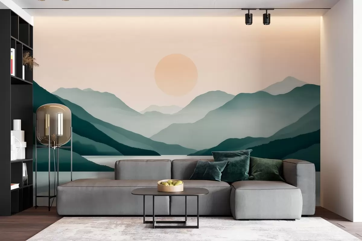 Fototapeten Ruhige Berglandschaft mit Sonne über dem See N° w09735