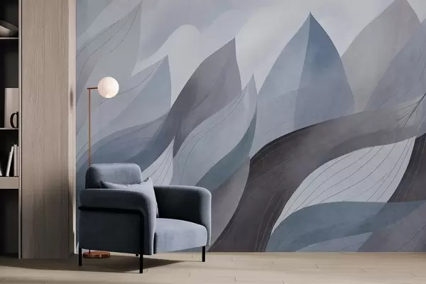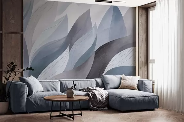 Fototapeten Abstrakte Blätter, gedämpfte Erdtöne in Blau mit zarten Liniendetails, weiche Aquarelltextur N° w09736v1