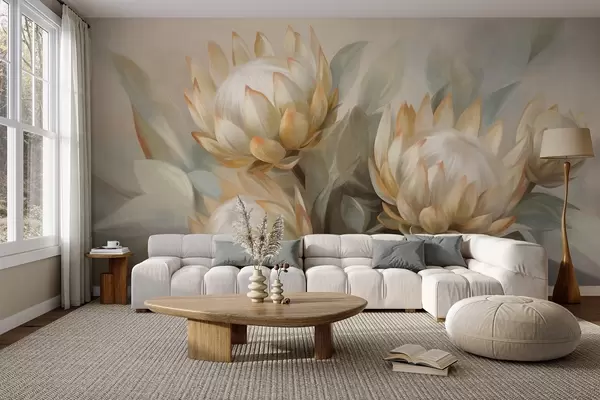 Fototapeten Strukturierte Protea-Blüten mit grünen Blättern und einem weichen, unscharfen Hintergrund N° w09738