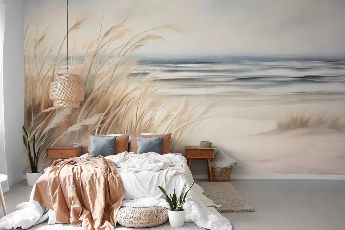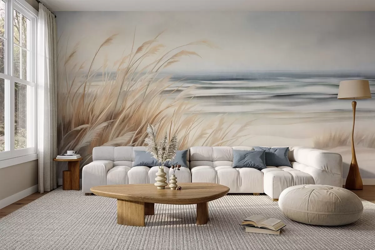 Fototapeten Strukturierte Landschaft mit trockenem Gras an einem Sandstrand, mit dem Meer und dem Himmel im Hintergrund N° w09739