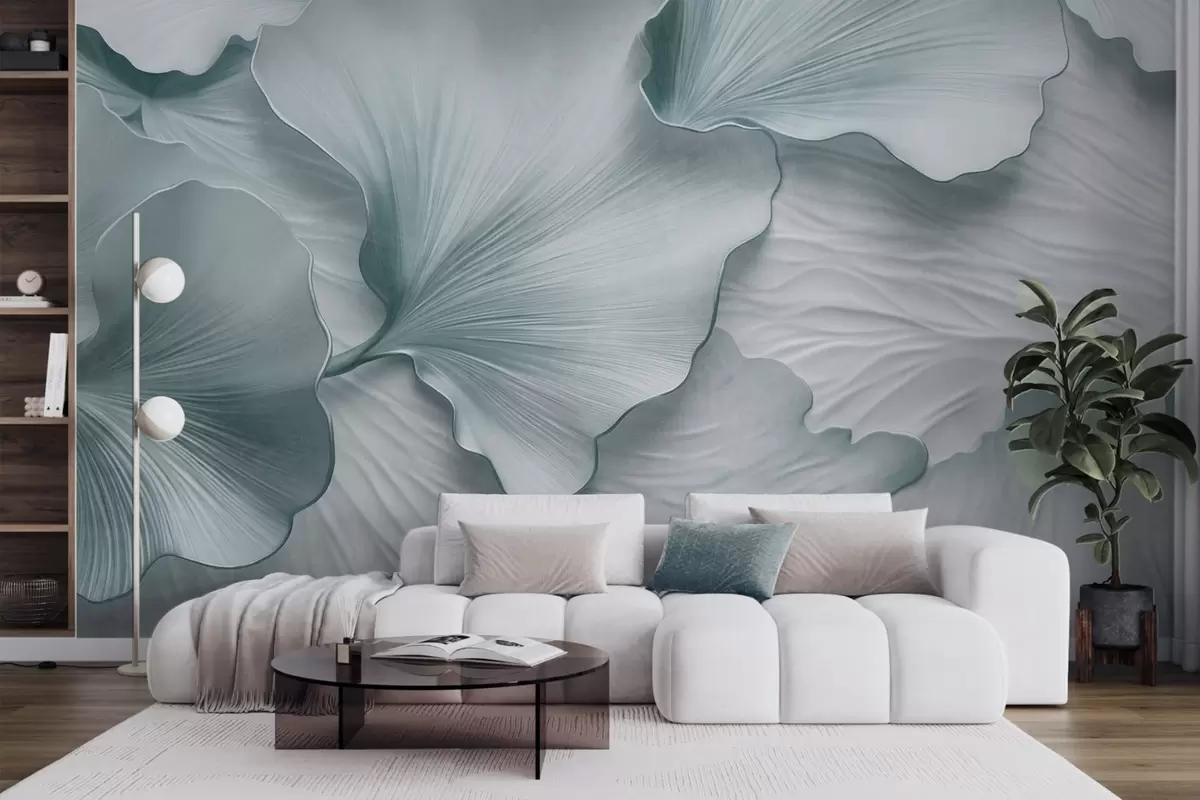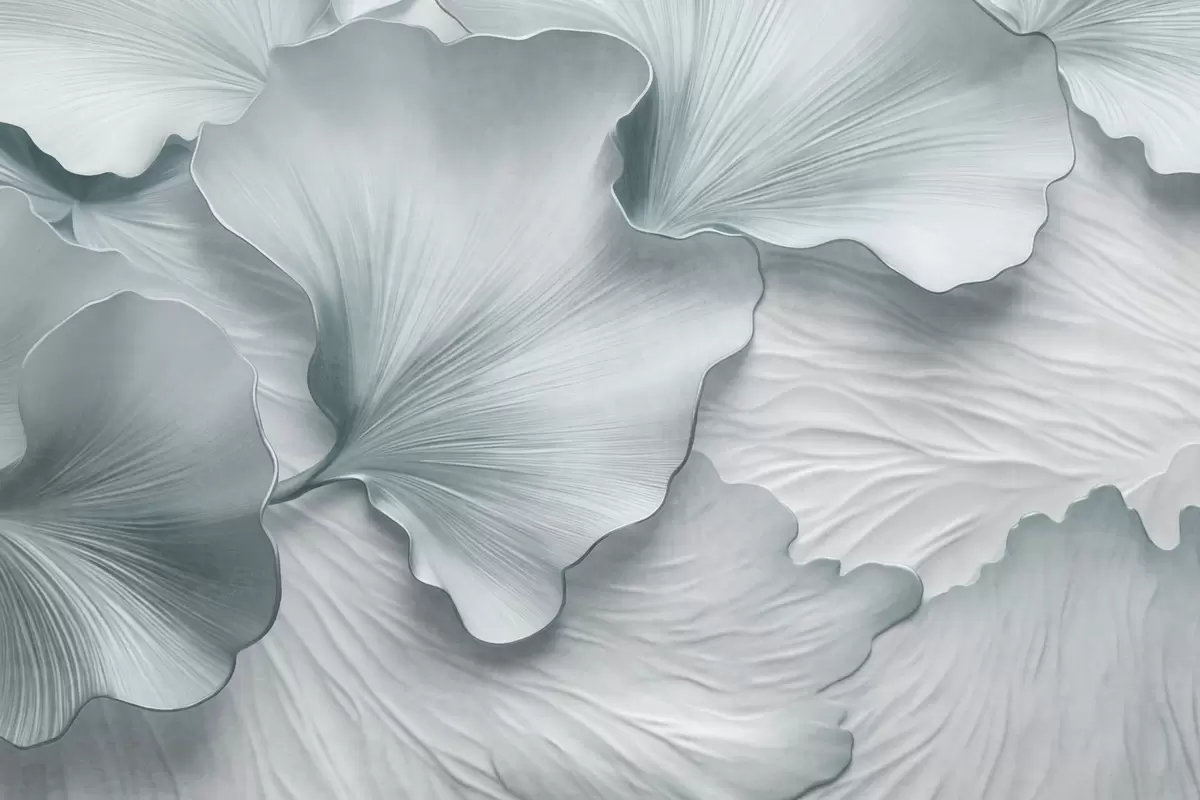 Fototapeten Strukturierte, blau-weiße Ginkgoblätter mit zartem Bio-Aufdruck N° w09741v1