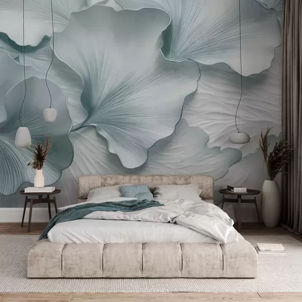 Fototapeten Strukturierte, blau-weiße Ginkgoblätter mit zartem Bio-Aufdruck N° w09741v1