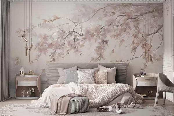 Fototapeten Strukturierte Landschaft mit Kirschblütenzweig, rosa Blättern, weichem, nebligem Hintergrund N° w09743