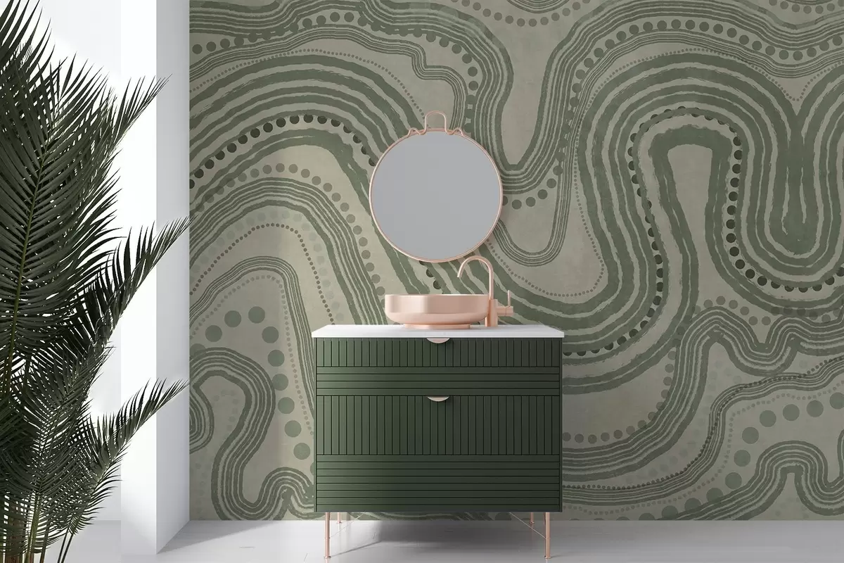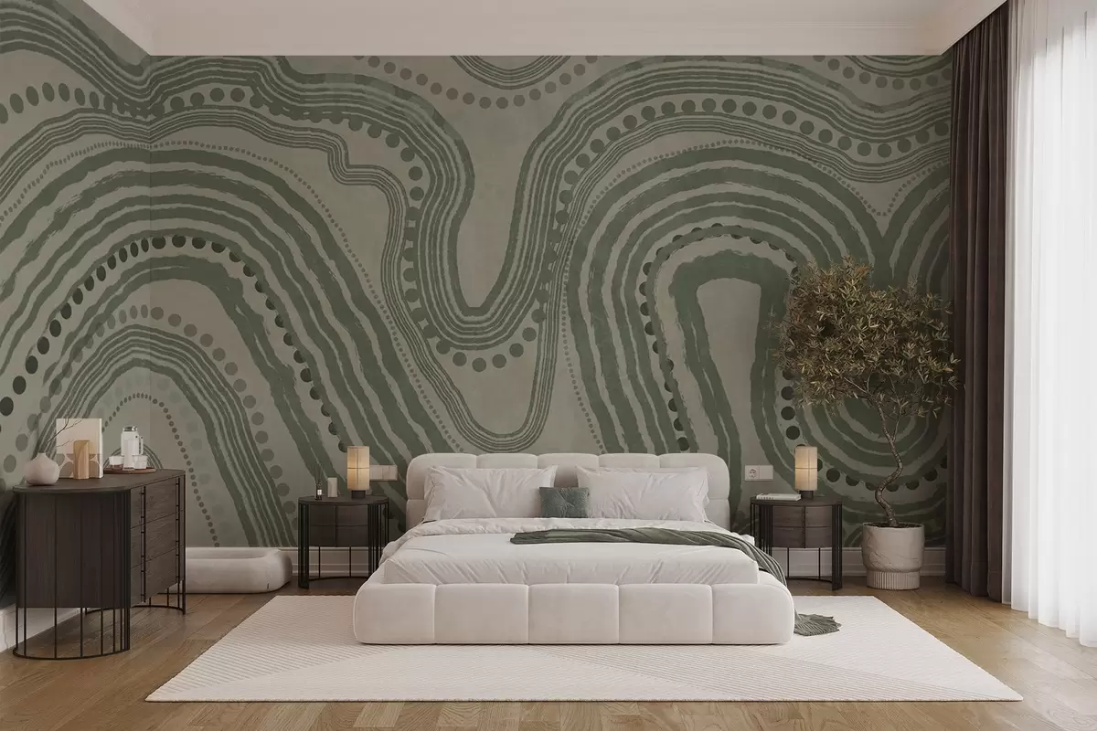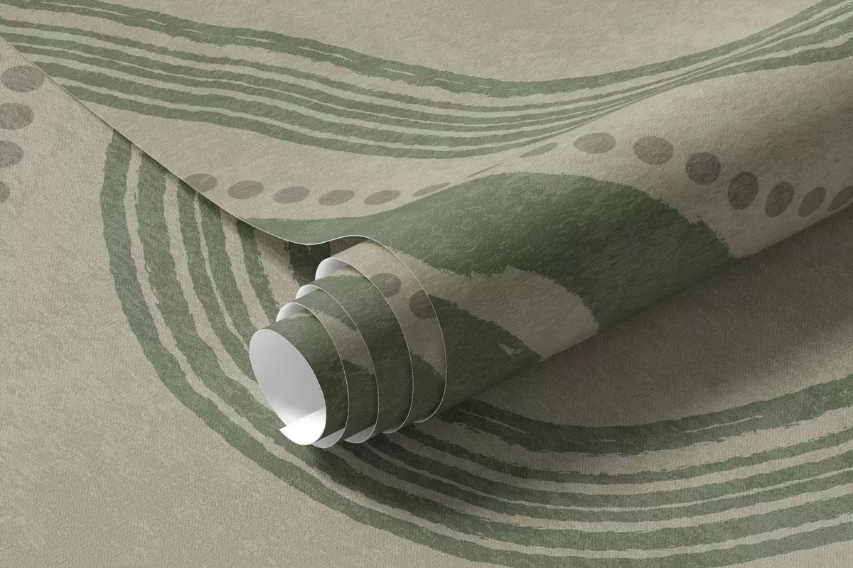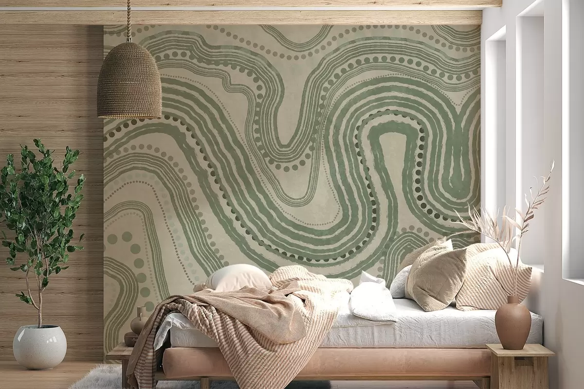 Fototapeten Abstrakte grüne und beige Wellenlinien und Punkte, moderne strukturierte Kunst N° w09747