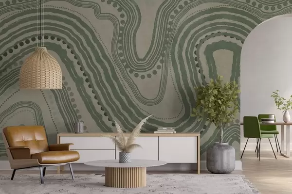Fototapeten Abstrakte grüne und beige Wellenlinien und Punkte, moderne strukturierte Kunst N° w09747