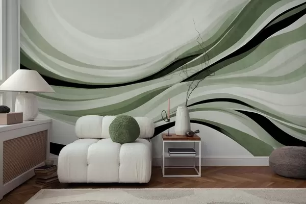 Fototapeten Abstrakte Wellenlinien in Grün- und Schwarztönen vor hellem Hintergrund, strukturierte Kunst N° w09748v1