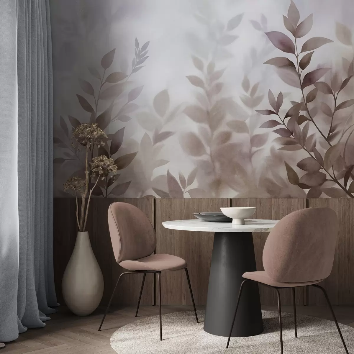 Fototapeten Zarte Zweige mit gedeckten braunen und beigen Blättern, Aquarellstil, strukturierte Kunst N° w09750