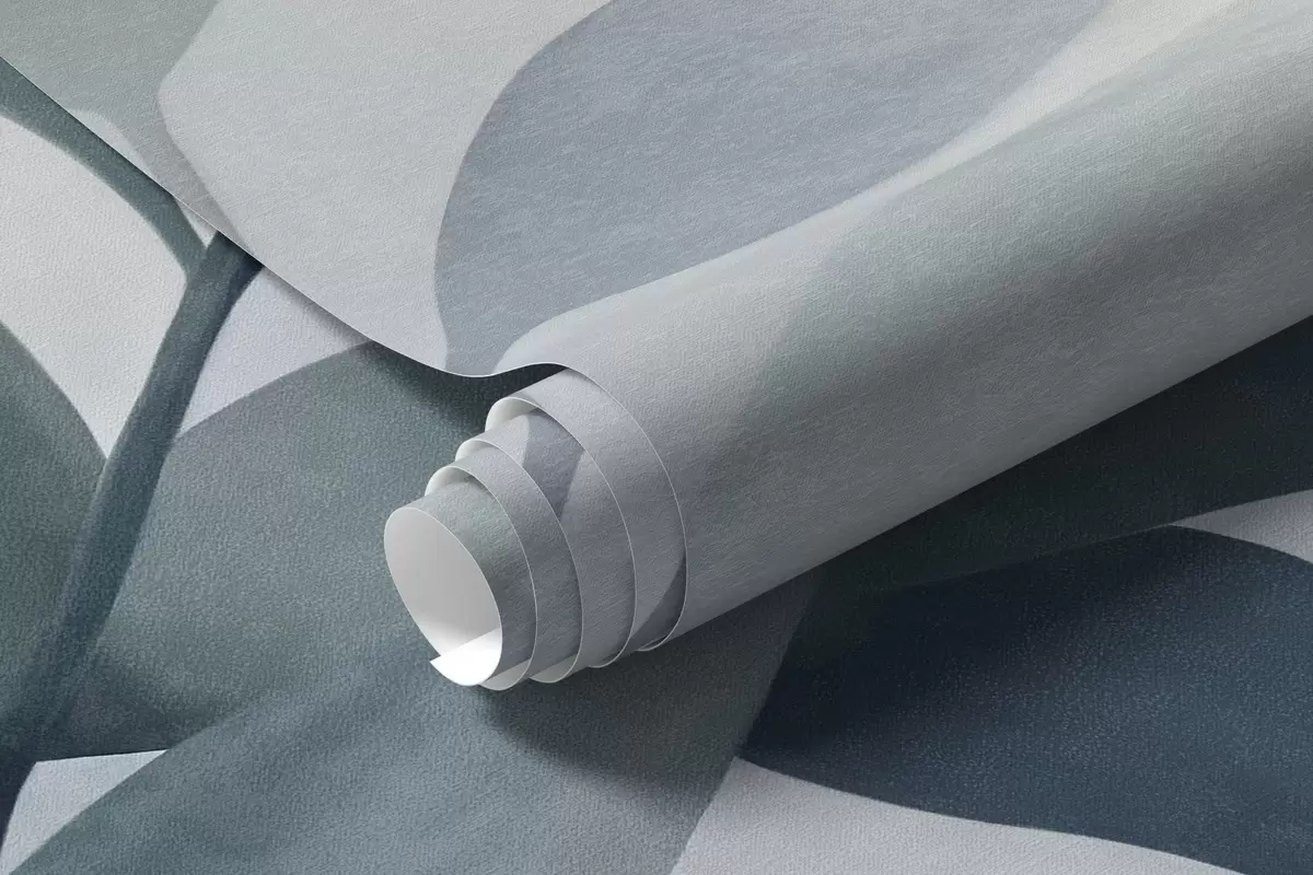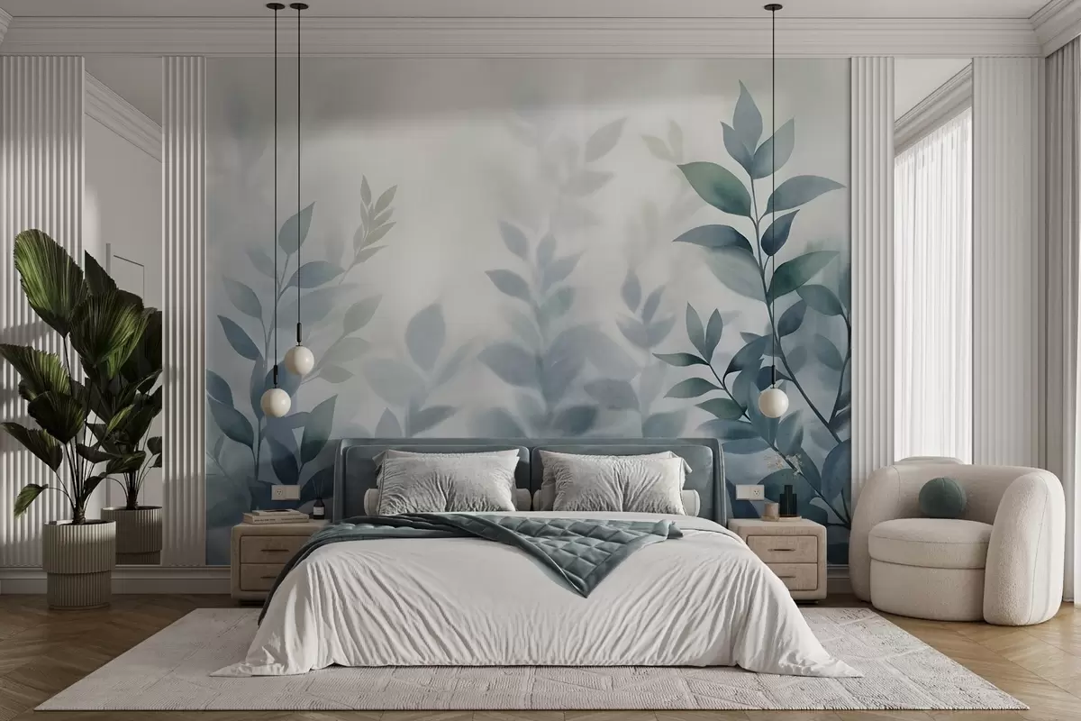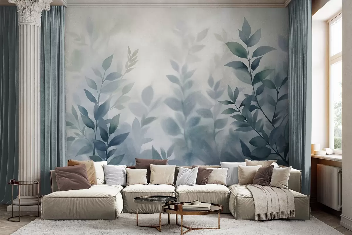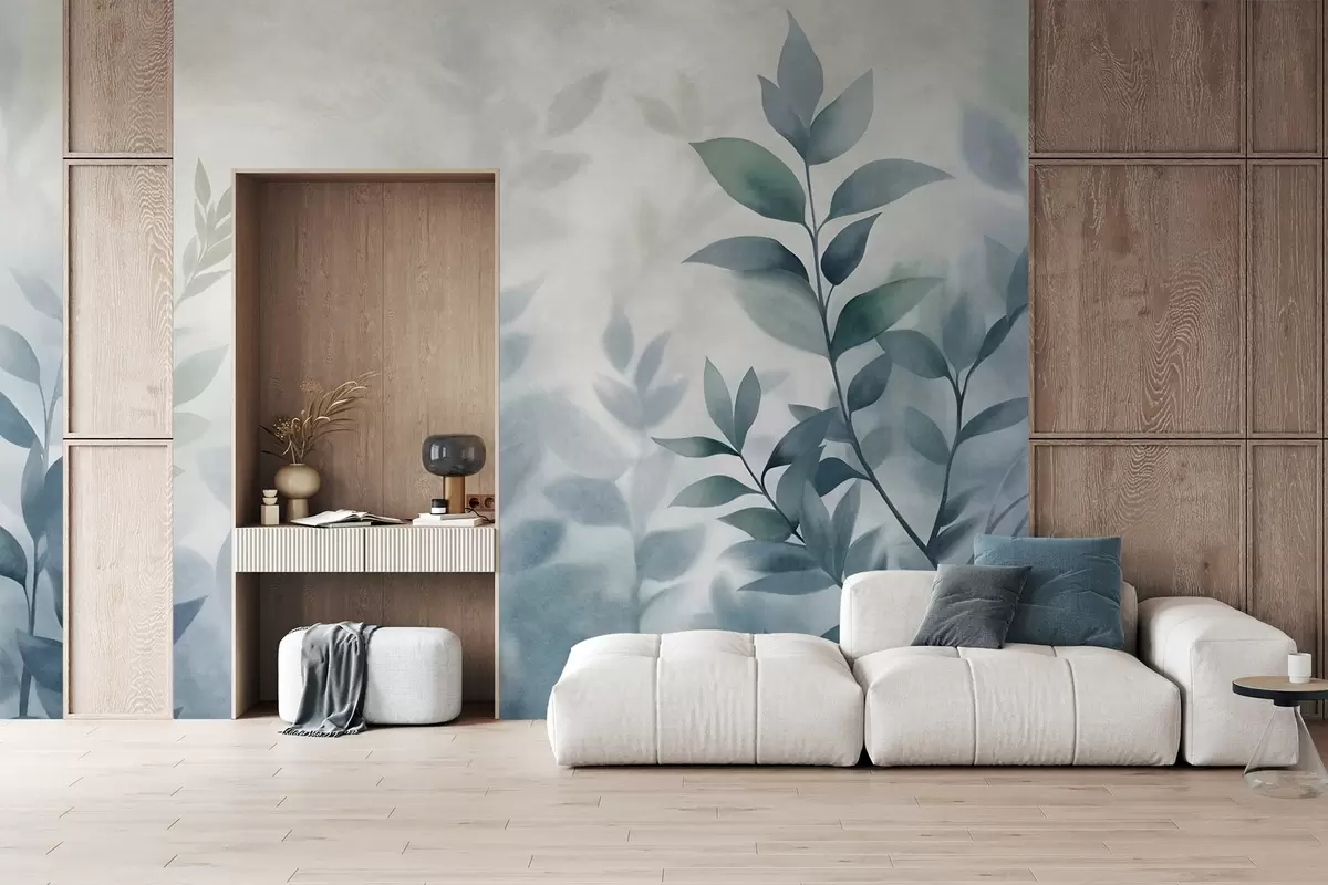 Fototapeten Zarte Zweige mit gedeckten blauen Blättern, Aquarellstil, strukturierte Kunst N° w09750v1