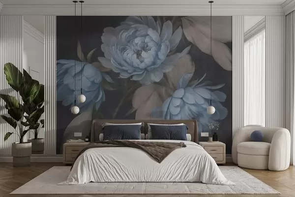Fototapeten Strukturierte hellblaue Pfingstrosenblüten mit beigen Blättern vor einem dunklen Hintergrund N° w09751