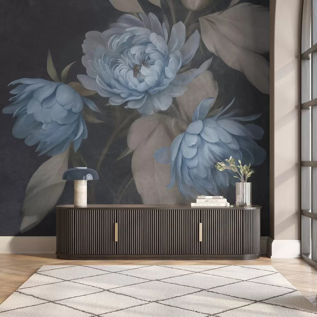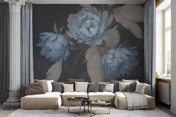 Fototapeten Strukturierte hellblaue Pfingstrosenblüten mit beigen Blättern vor einem dunklen Hintergrund N° w09751