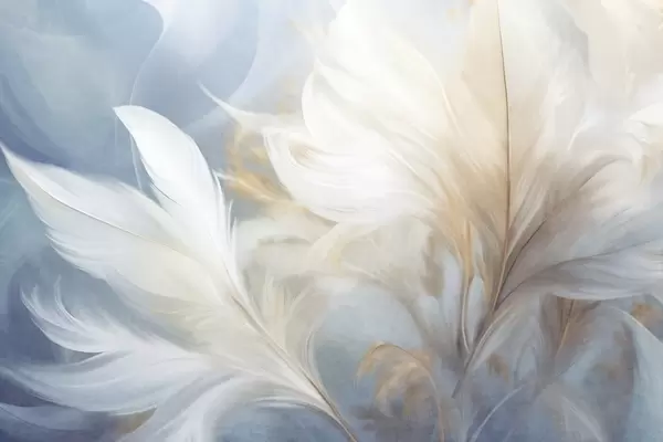 Fototapeten Weiche, weiße Federn mit Struktur und verschwommenes Pampasgras vor blau-weißem Hintergrund N° w09758