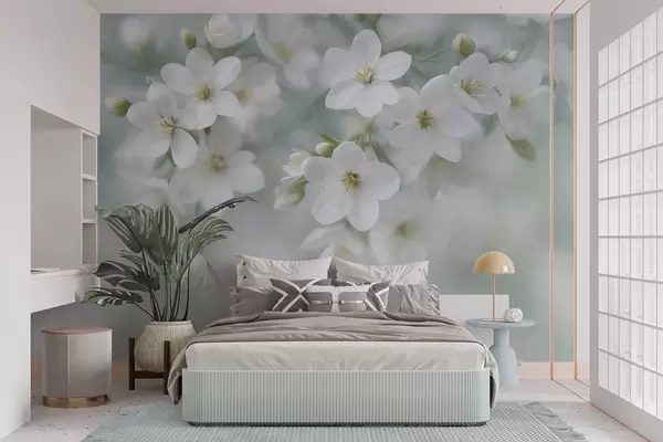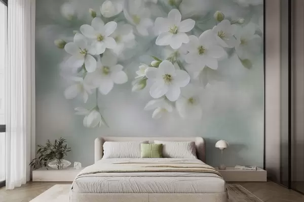 Fototapeten Zarte, strukturierte weiße Blüten, die im Hintergrund sanft verschwimmen N° w09759