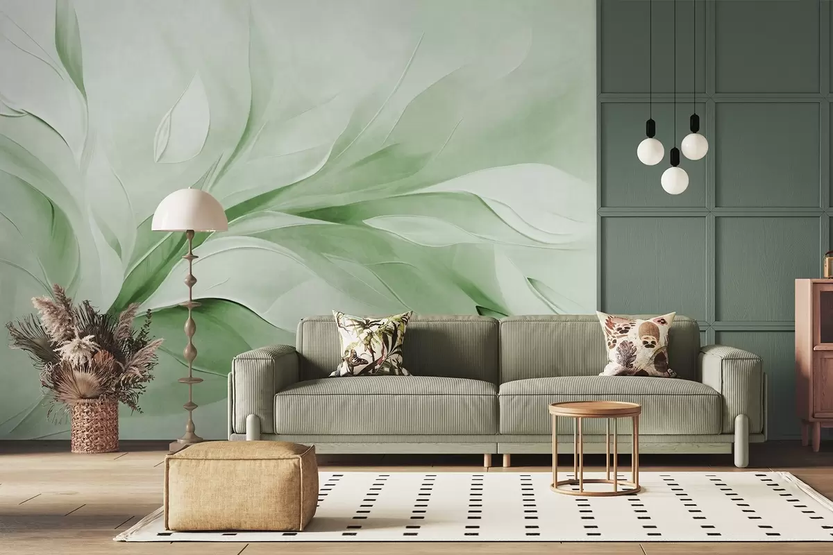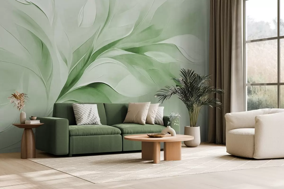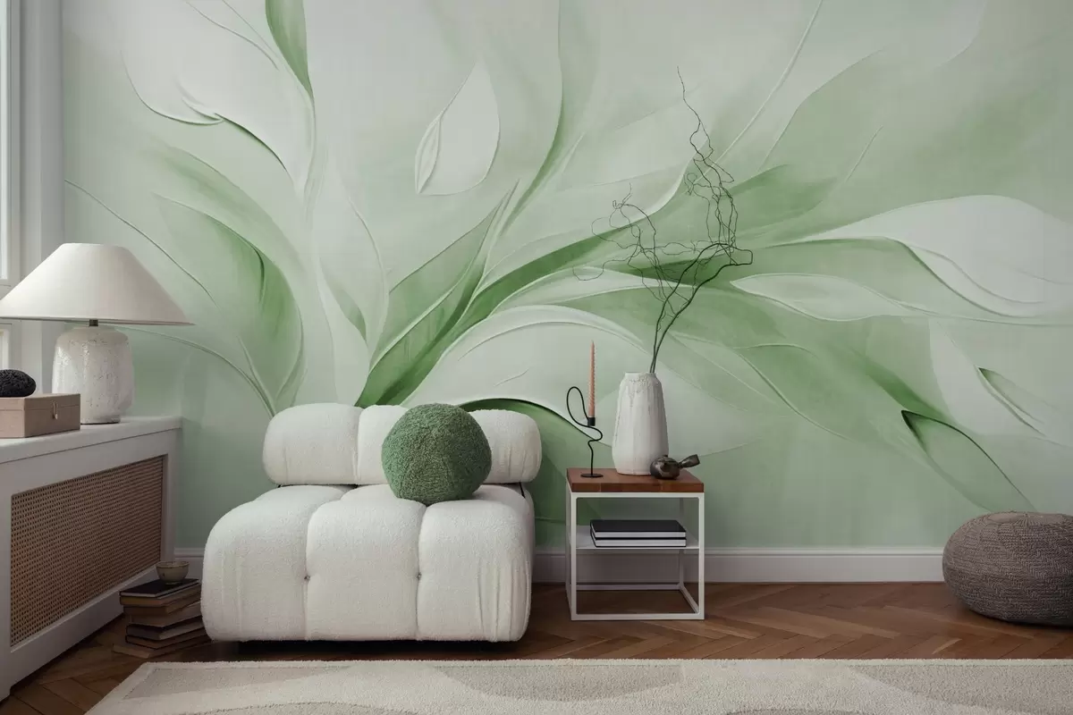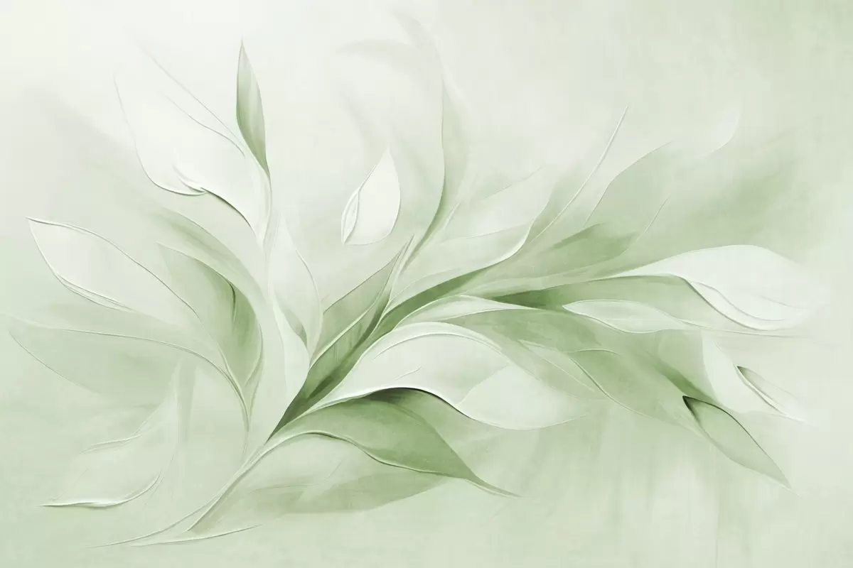Fototapeten Abstrakter, strukturierter Malstil mit fließenden Blättern in Grün und Weiß N° w09765v2