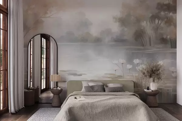 Fototapeten Eine abwechslungsreiche Landschaft, ein See mit weißen Seerosen, umgeben von Bäumen in gedämpften Farben N° w09768