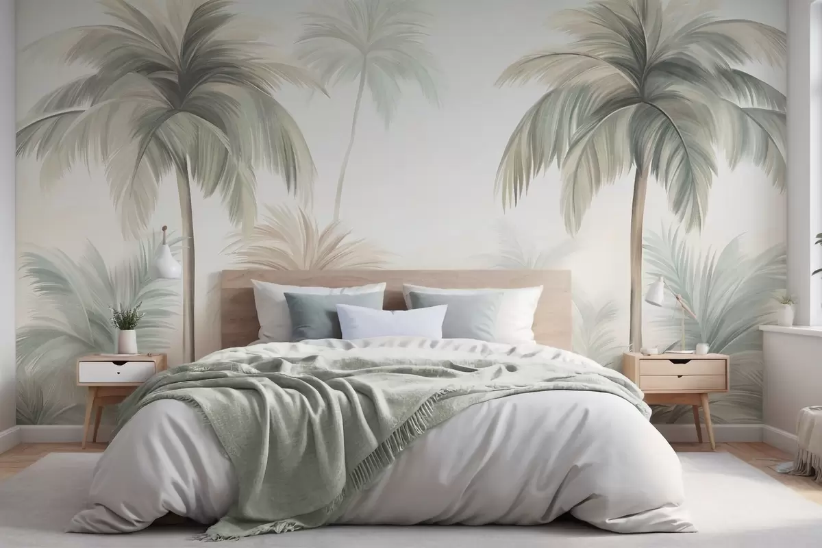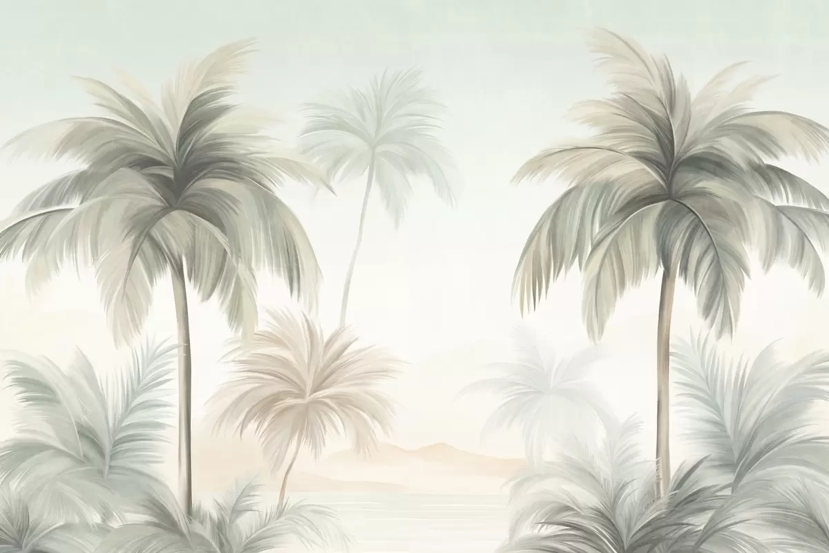 Fototapeten Palmen mit strukturierten Blättern in gedämpften Grün- und Beigetönen vor einem sanften Himmel N° w09770