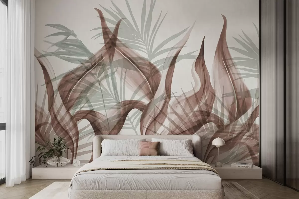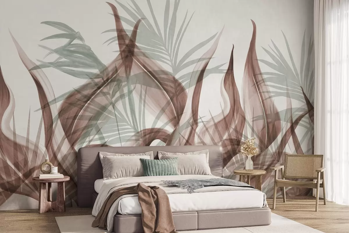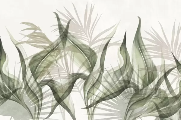 Fototapeten Tropische Blätter in Braun- und Grüntönen vor weißem Hintergrund, strukturierter Aquarellstil N° w09772