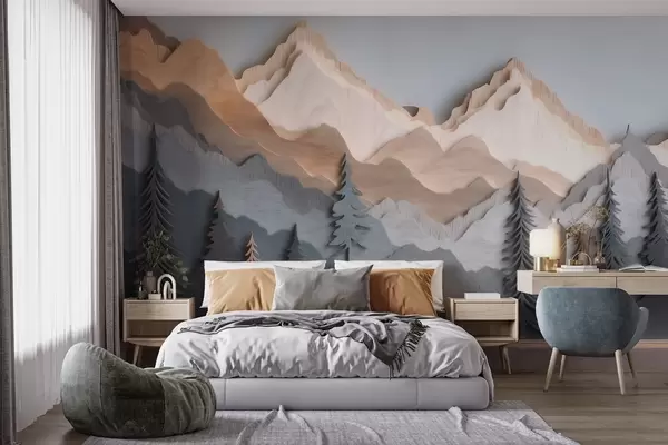 Fototapeten Naturlandschaft mit Kiefern und Bergen im Holzschnitzstil N° w09793