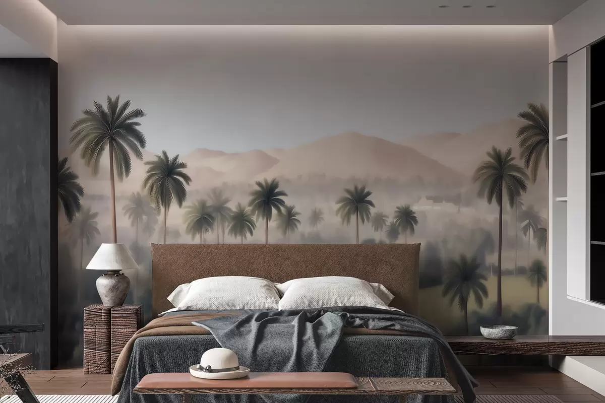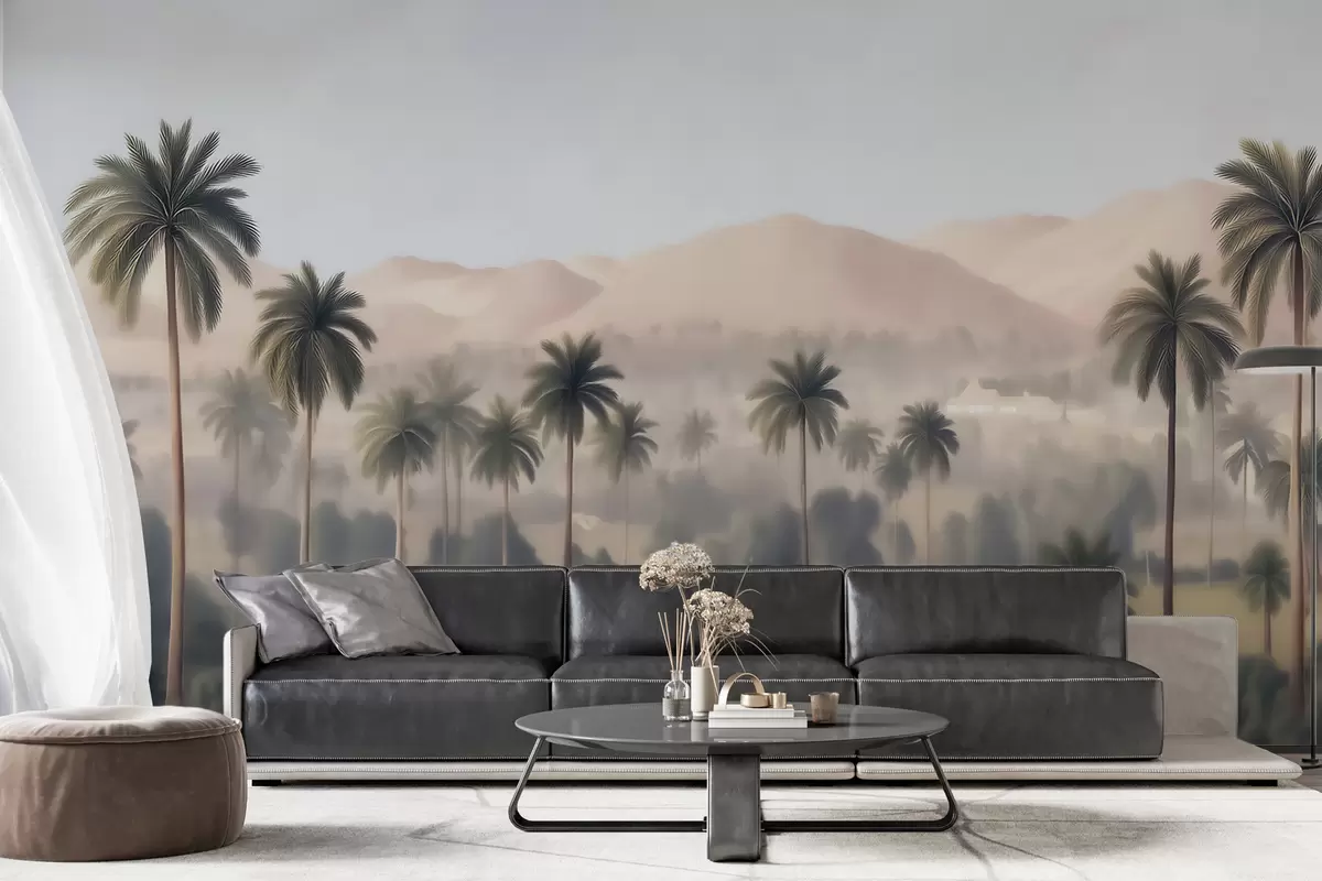 Fototapeten Tropische Landschaft mit Palmen und Bergen, Vintage-Panorama in Beige- und Grüntönen N° w09798