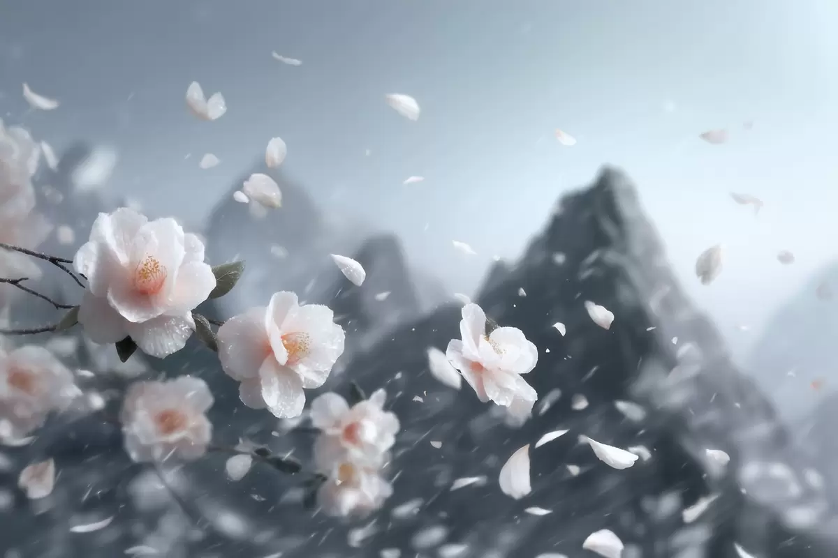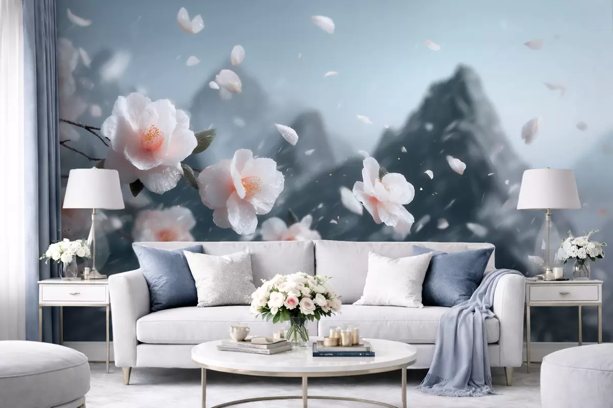 Fototapeten Zarte Kirschblüten vor einer Bergkulisse, stimmungsvolle japanische Landschaft in Pastelltönen N° w09808