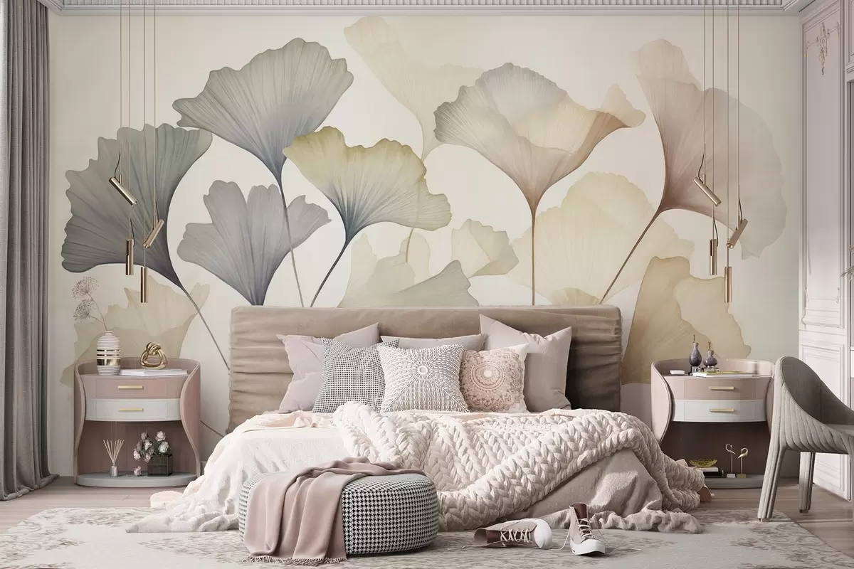 Fototapeten Abstrakte Ginkgoblätter in gedeckten Pastelltönen wie Blau, Grün und Pfirsich, strukturierte Kunst N° w09810