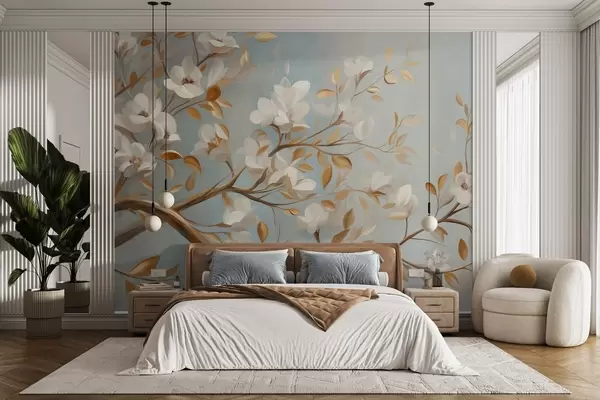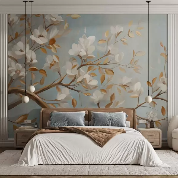Fototapeten Strukturierter Ast mit weißen Blüten und gelben Blättern, im Vintage-Stil N° w09814