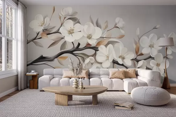 Fototapeten Ein strukturierter Ast mit weißen Blüten und braunen Blättern vor einem hellgrauen Hintergrund N° w09817