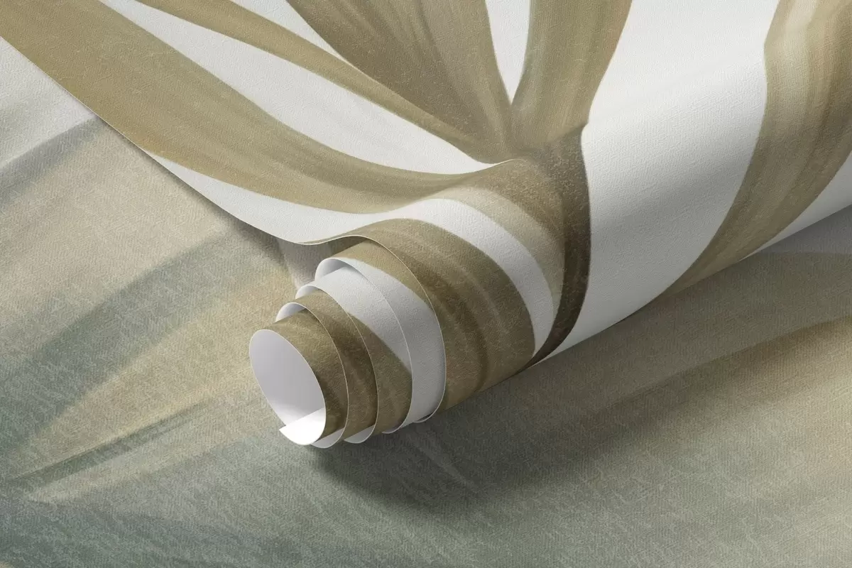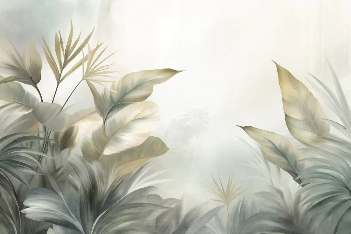 Fototapeten Große, strukturierte tropische Blätter in gedämpften Grün- und Beigetönen, eine Dschungelkulisse N° w09820