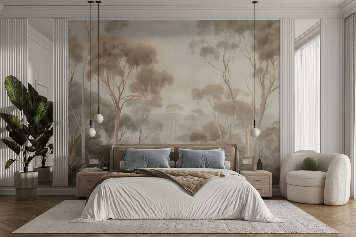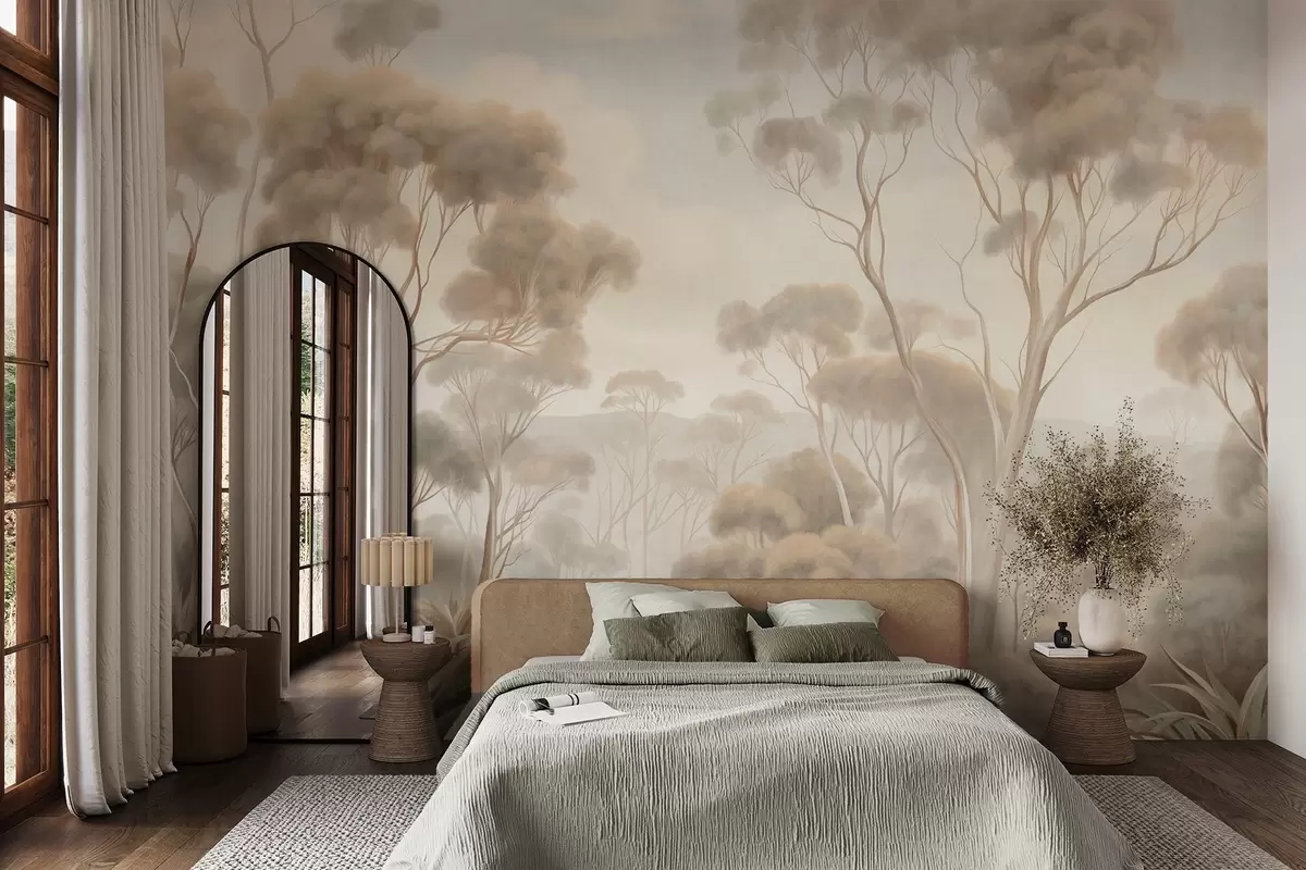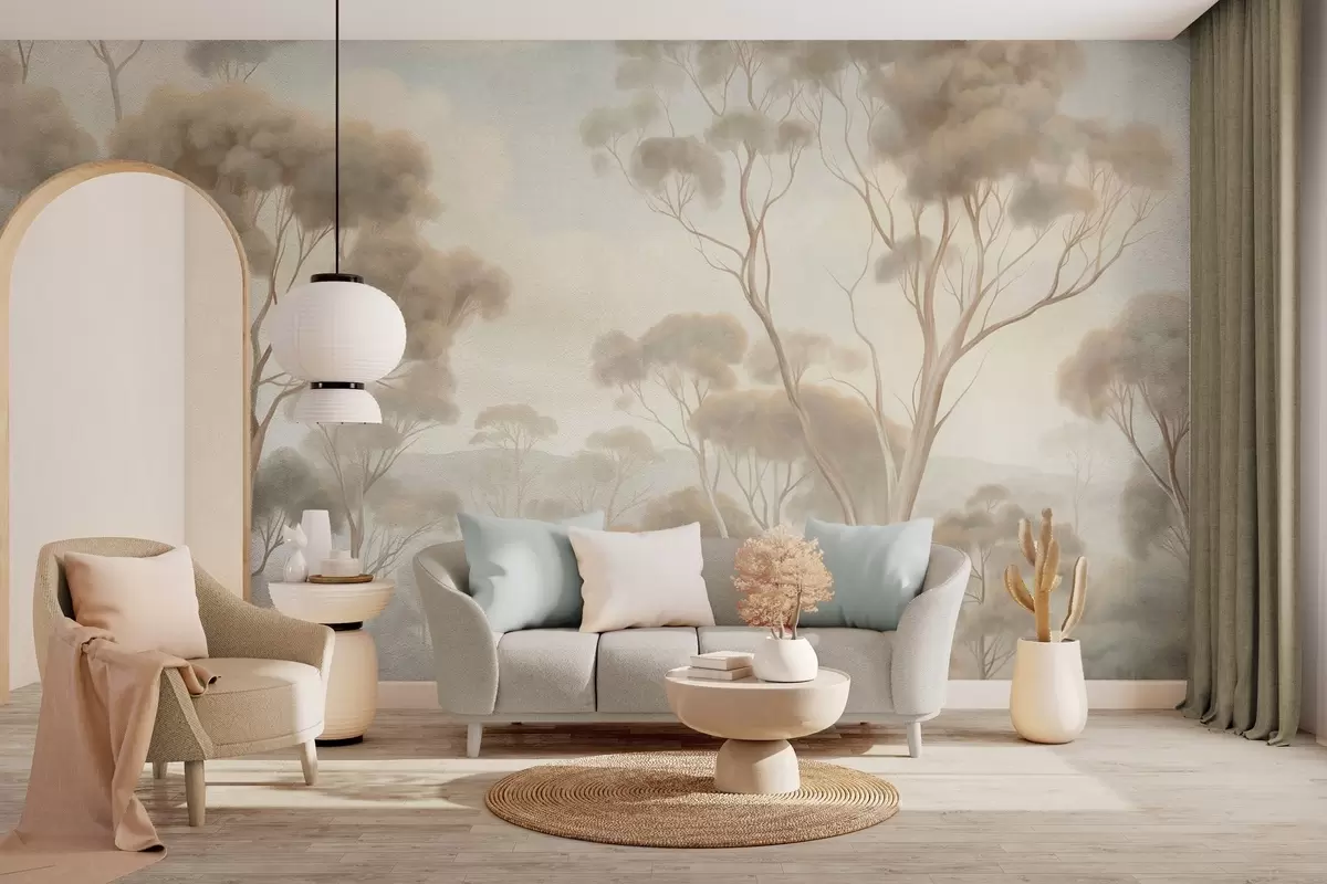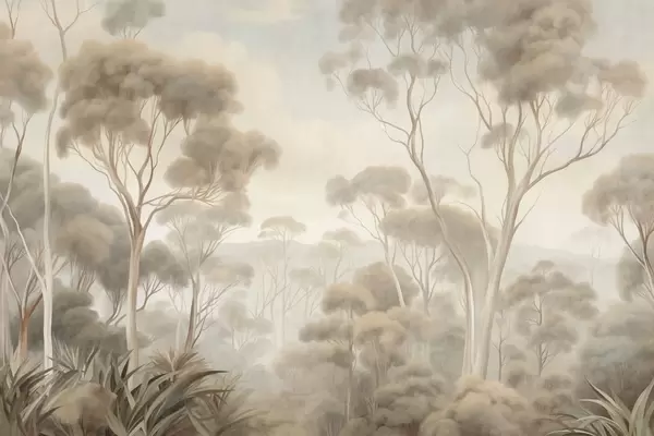 Fototapeten Eine neblige Waldlandschaft mit hohen Eukalyptusbäumen, sanften Hügeln unter bewölktem Himmel, strukturierte Grafik N° w09822