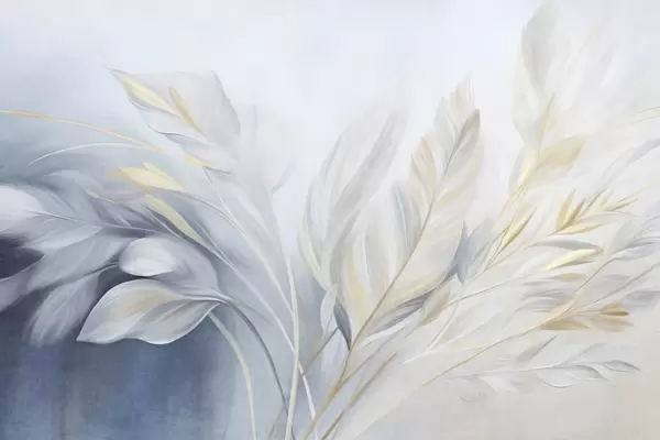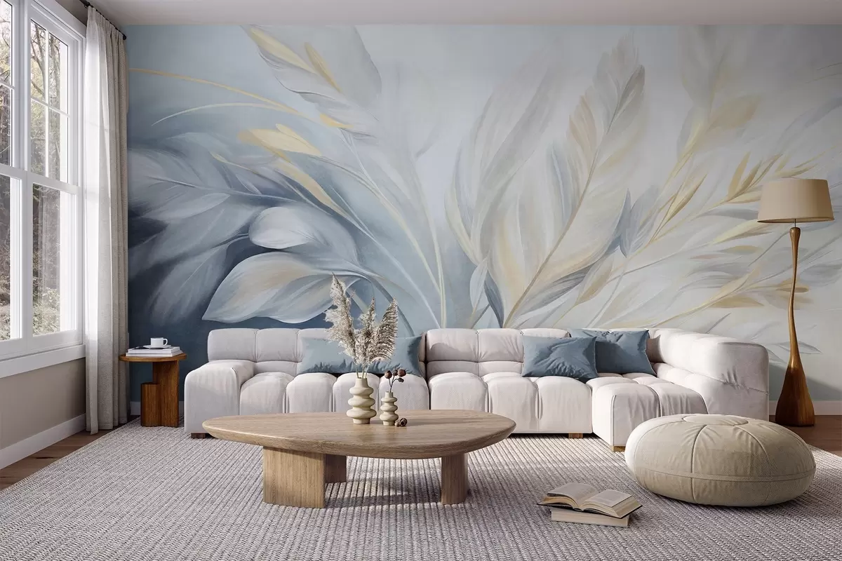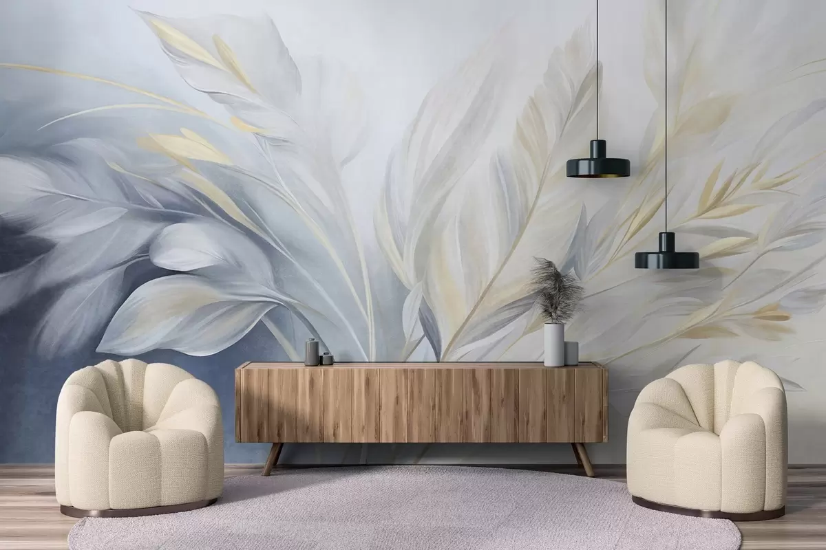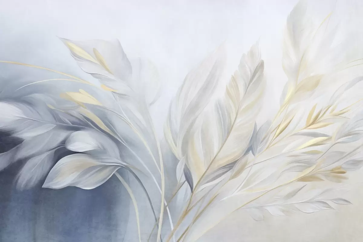 Fototapeten Strukturierte Federn mit gelben Akzenten vor einem sanften Hintergrund aus Hellblau und Weiß N° w09826