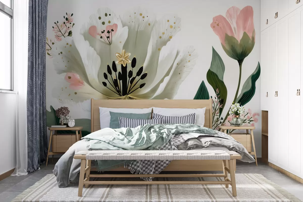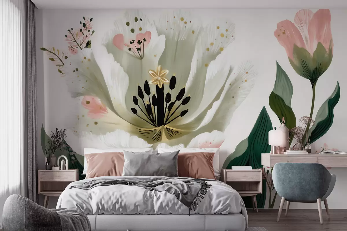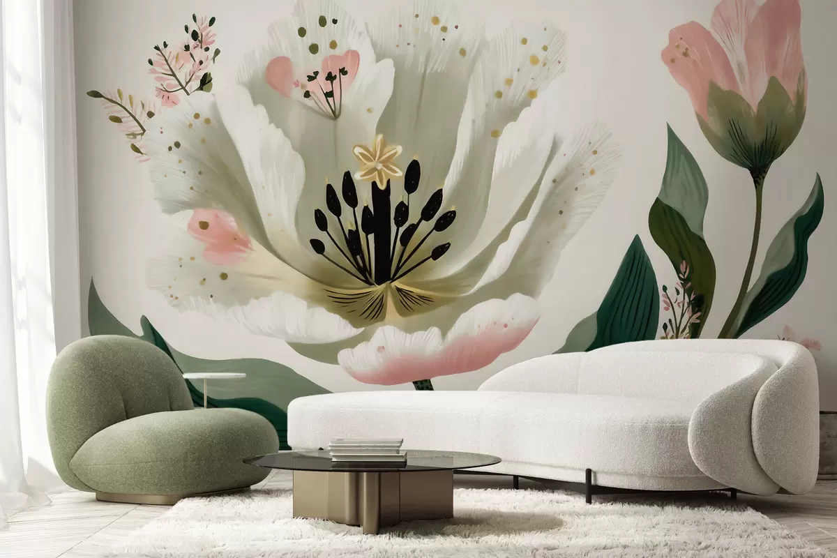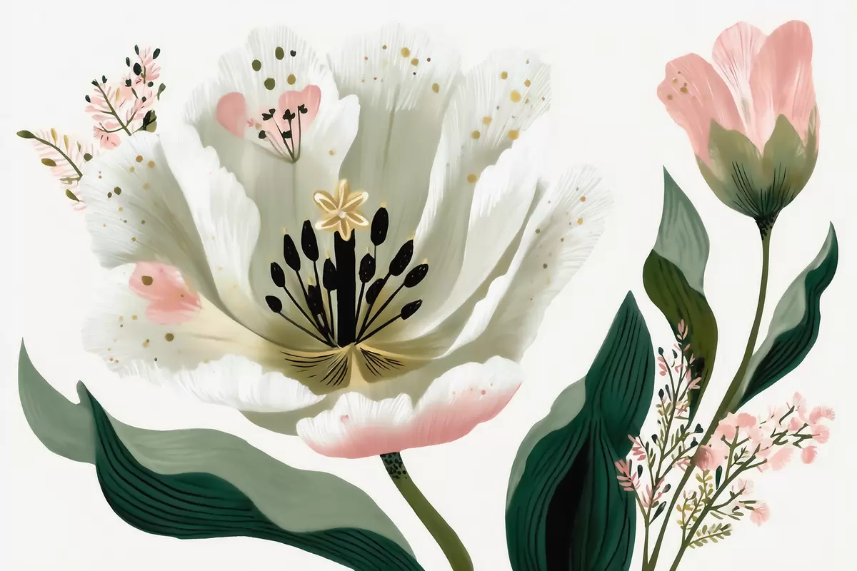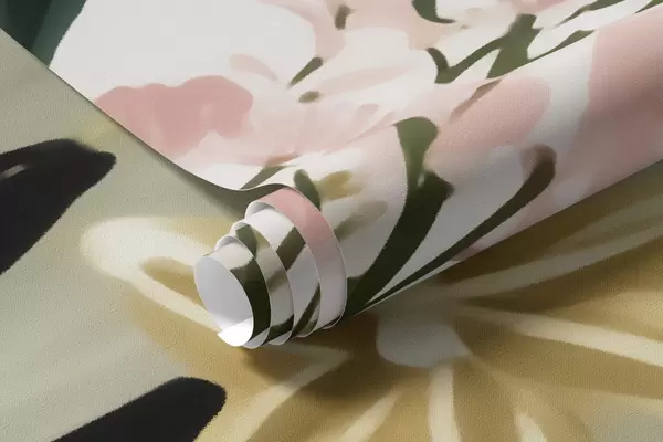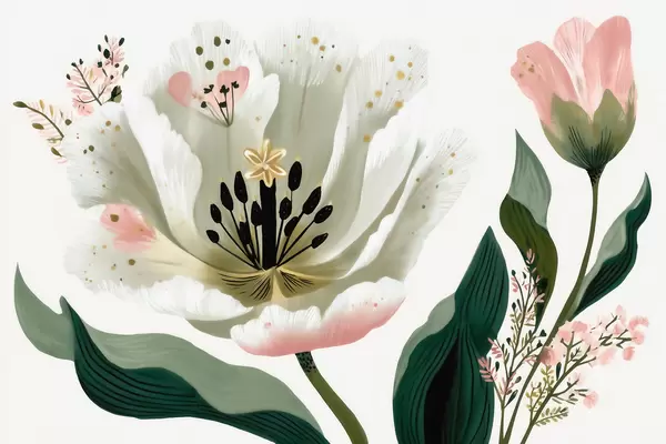 Fototapeten Eine Blume mit grünen Blättern und zartrosa Akzenten im Aquarellstil N° w09836