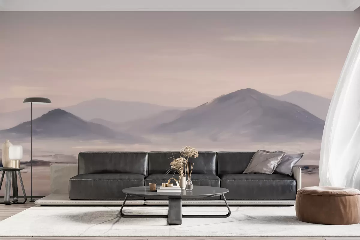 Fototapeten Eine neblige Berglandschaft mit sanften Übergängen von Licht und Luft, die einen maskenartigen Effekt erzeugt N° w09844