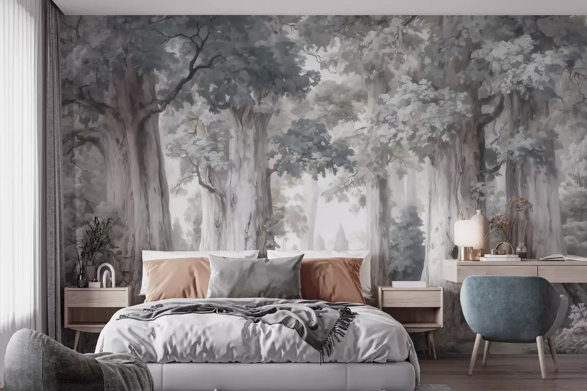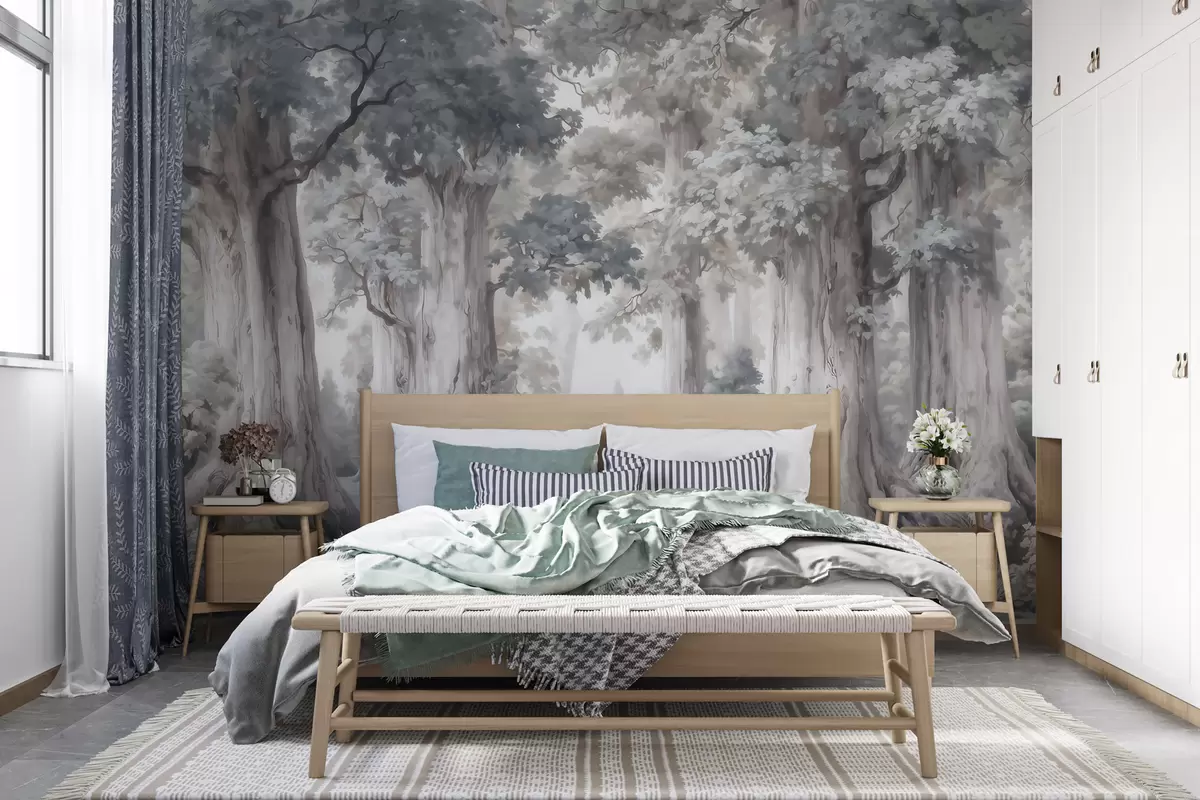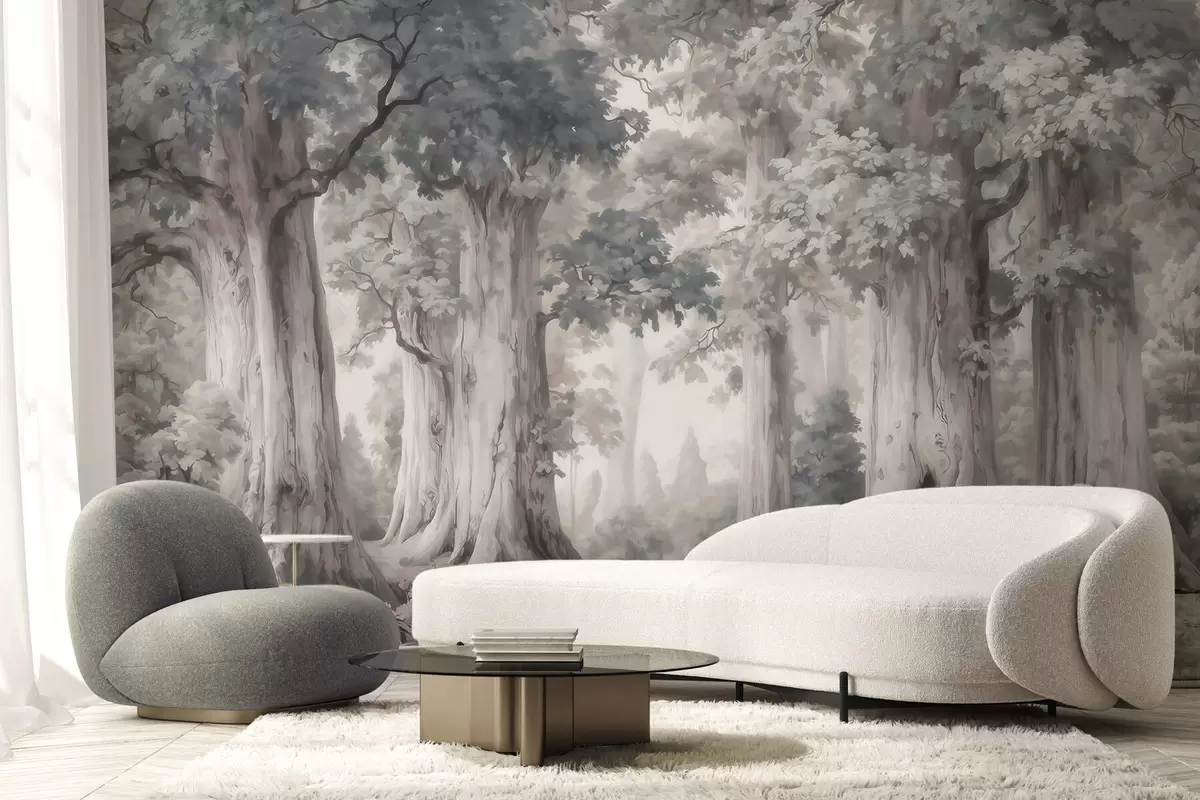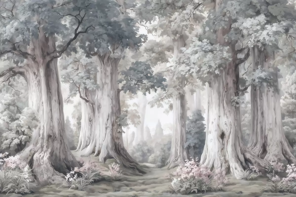 Fototapeten Ein märchenhafter Wald mit hohen Bäumen und einer sanften, gedämpften Farbpalette im Aquarellstil N° w09849