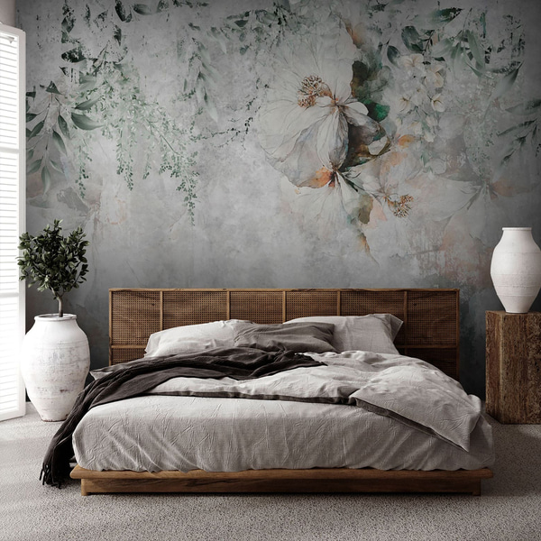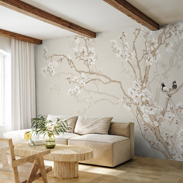 Fototapeten Perlmuttfarbene Blüten in Beige-Grau- und Milchcreme-Tönen