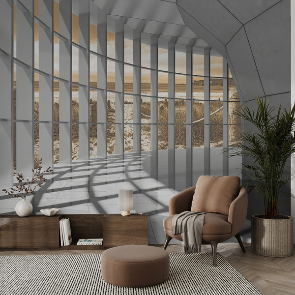 Fototapeten Winterlandschaft mit See und Wald, Berge, Pastell Stil darwing