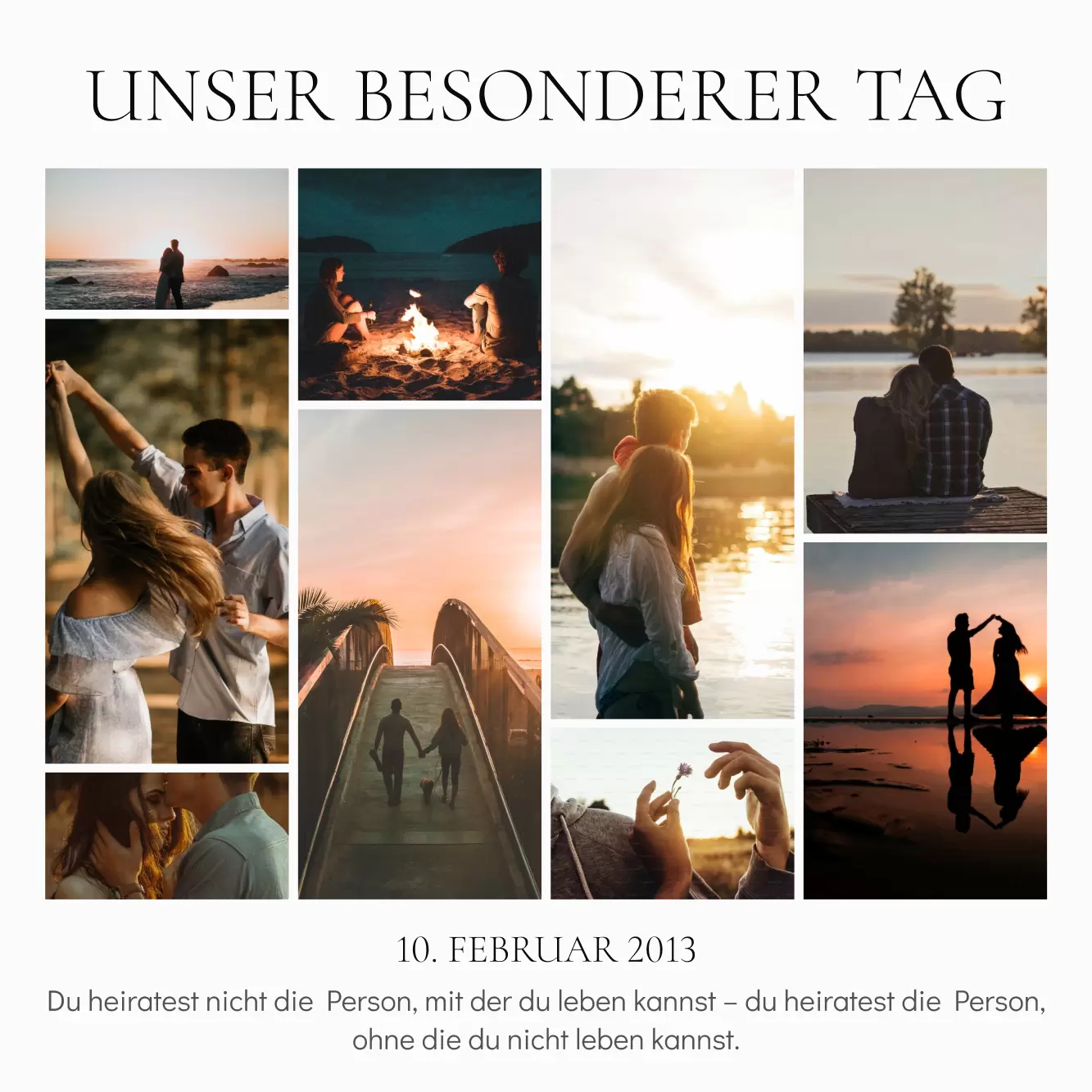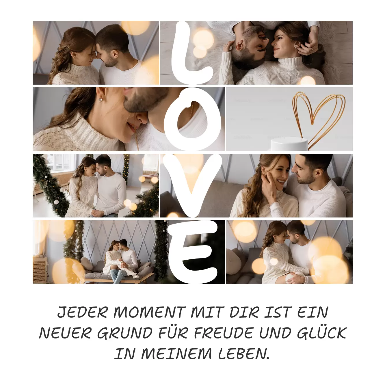 Eine Fotocollage auf Leinwand ist ein besonderes Geschenk, das Ihre persönlichen Erinnerungen und Fotos zu einem Ganzen vereint. Wählen Sie Ihre Lieblingsbilder aus Ihrem Fotoarchiv und kombinieren Sie sie zu einer Collage.