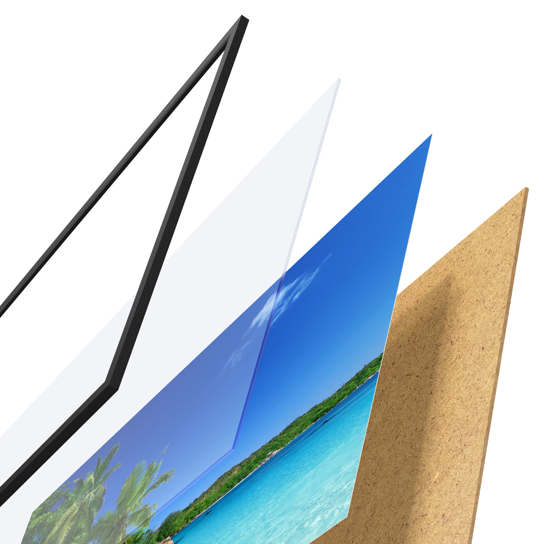 Das Poster besteht aus einem Rahmen, Plexiglas, einem gedruckten Bild und einer Rückwand aus Spanplatten. Dank der Halterungen auf der Rückseite kann das Poster sofort an die Wand gehängt werden.