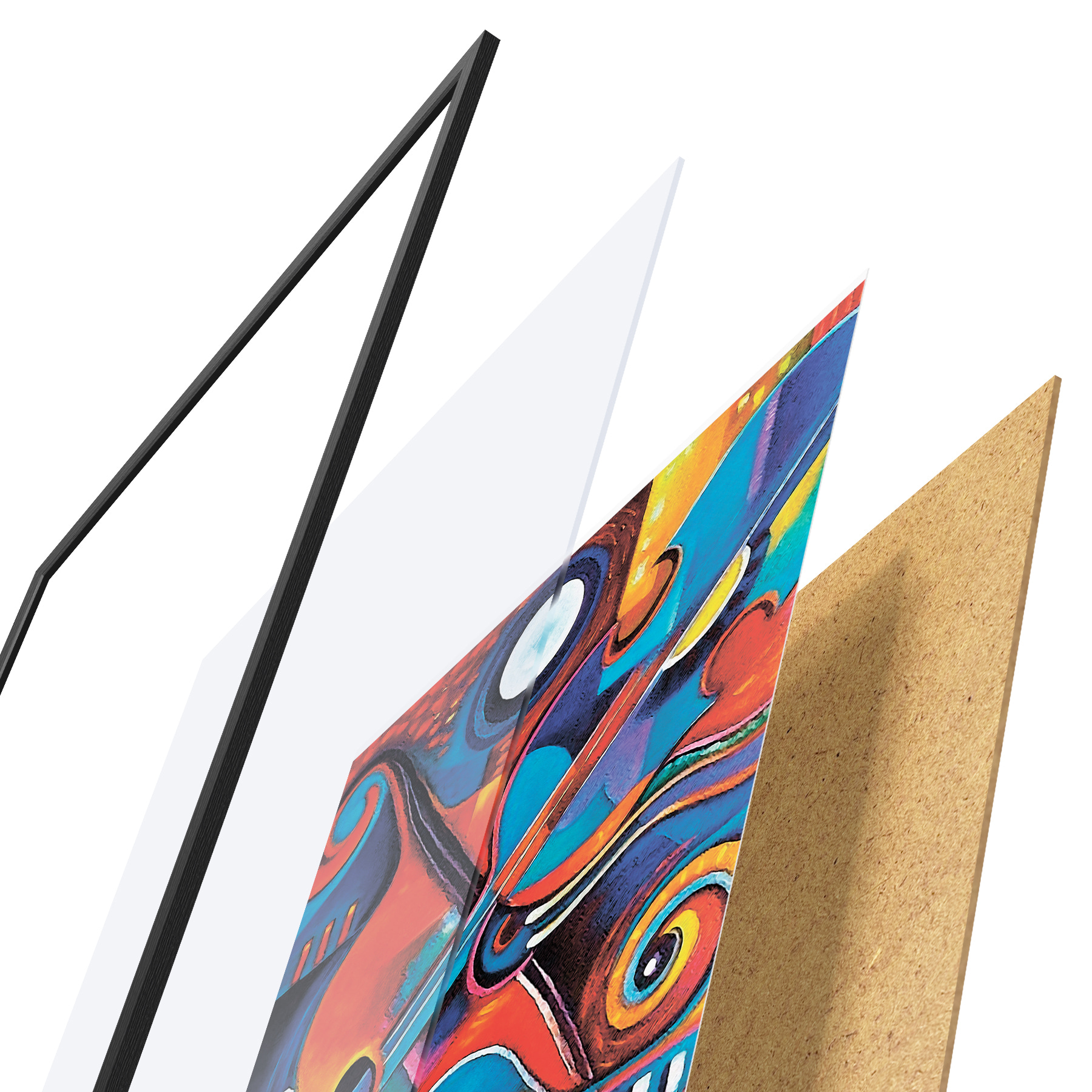 Das Poster besteht aus einem Rahmen, Plexiglas, einem gedruckten Bild und einer Rückwand aus Spanplatten. Dank der Halterungen auf der Rückseite kann das Poster sofort an die Wand gehängt werden.