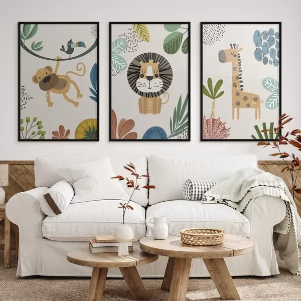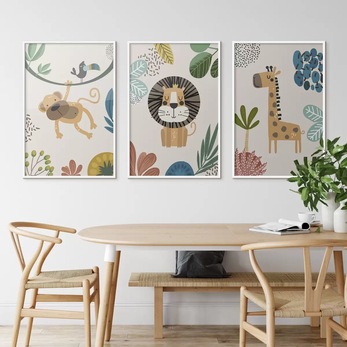 Poster Tiere im Dschungel im Safari-Stil, Boho: Affe, Löwe, Giraffe d00332