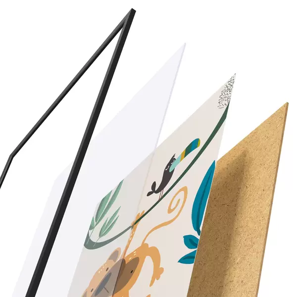Das Poster besteht aus einem Rahmen, Plexiglas, einem gedruckten Bild und einer Rückwand aus Spanplatten. Dank der Halterungen auf der Rückseite kann das Poster sofort an die Wand gehängt werden.