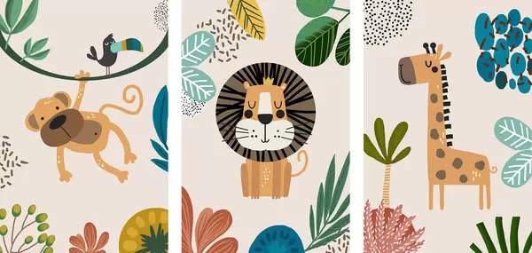 Poster Tiere im Dschungel im Safari-Stil, Boho: Affe, Löwe, Giraffe d00332