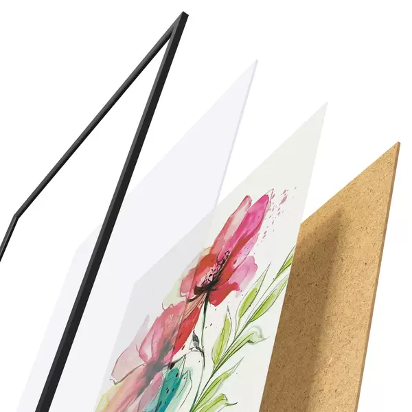 Das Poster besteht aus einem Rahmen, Plexiglas, einem gedruckten Bild und einer Rückwand aus Spanplatten. Dank der Halterungen auf der Rückseite kann das Poster sofort an die Wand gehängt werden.