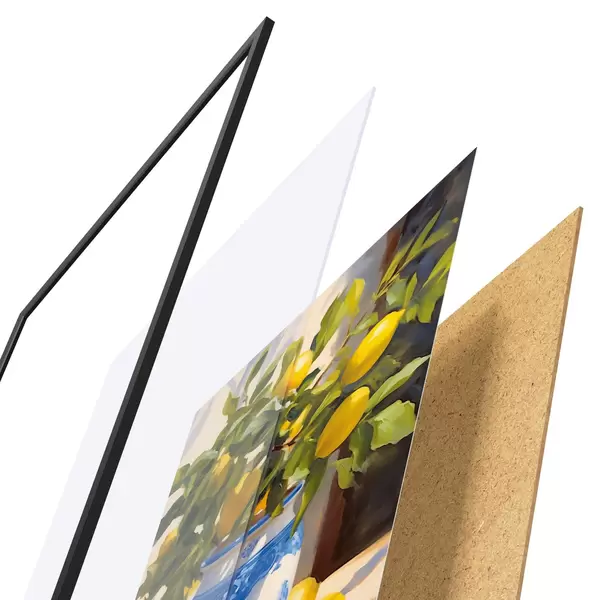 Das Poster besteht aus einem Rahmen, Plexiglas, einem gedruckten Bild und einer Rückwand aus Spanplatten. Dank der Halterungen auf der Rückseite kann das Poster sofort an die Wand gehängt werden.