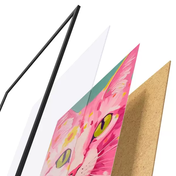 Das Poster besteht aus einem Rahmen, Plexiglas, einem gedruckten Bild und einer Rückwand aus Spanplatten. Dank der Halterungen auf der Rückseite kann das Poster sofort an die Wand gehängt werden.