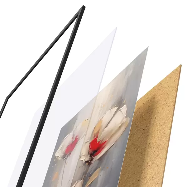 Das Poster besteht aus einem Rahmen, Plexiglas, einem gedruckten Bild und einer Rückwand aus Spanplatten. Dank der Halterungen auf der Rückseite kann das Poster sofort an die Wand gehängt werden.