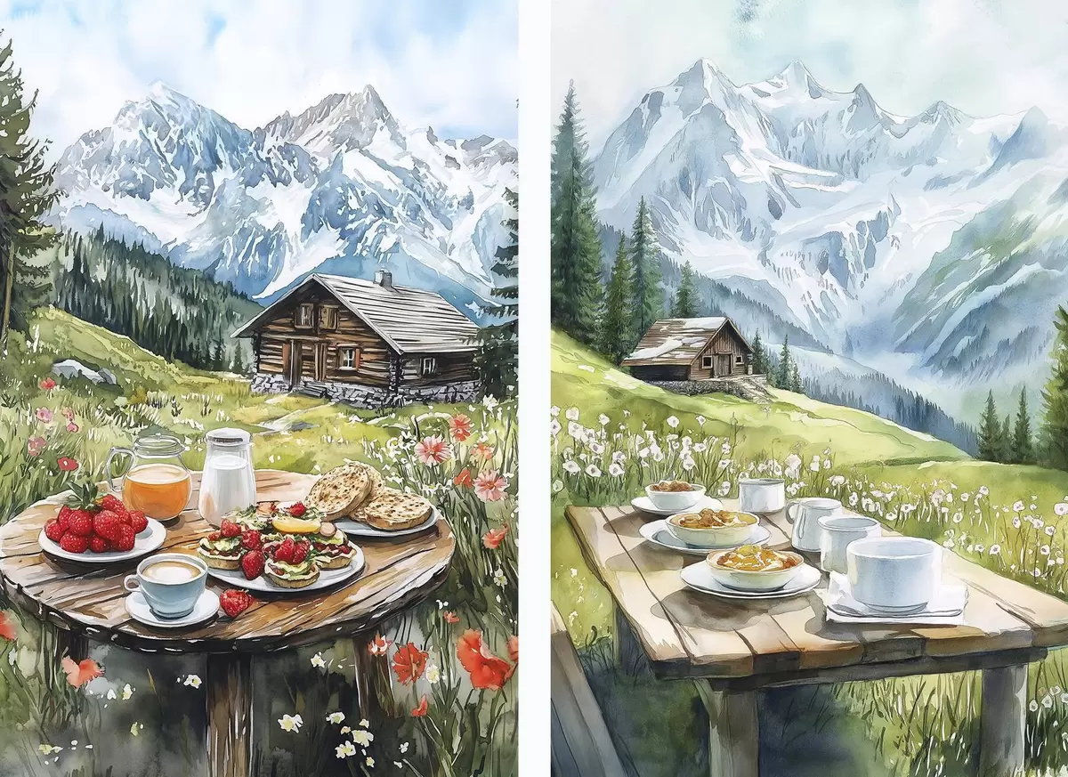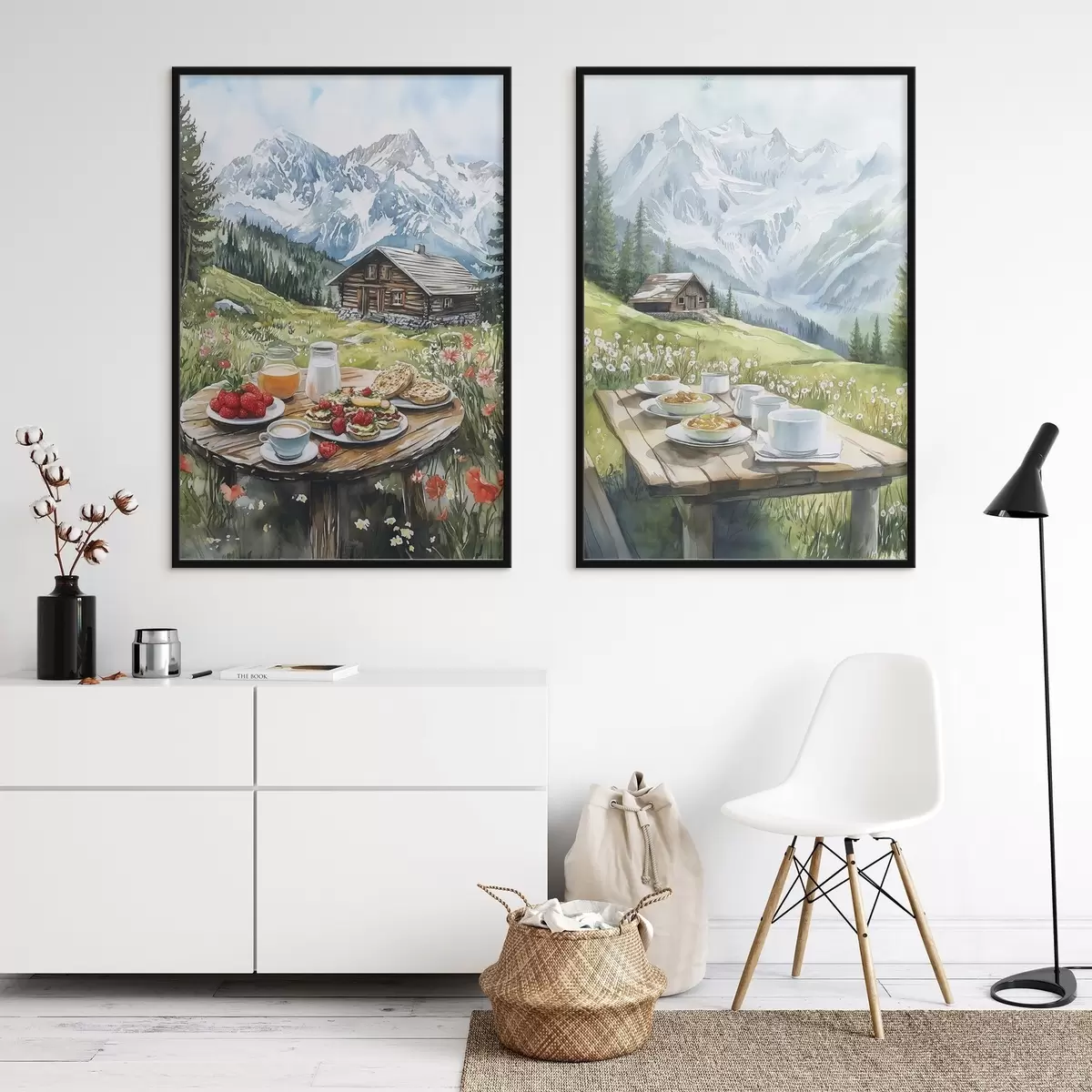 Poster Die Alpen, schöne Berglandschaft, ästhetisches Frühstück, Holzhäuser Nr d00403