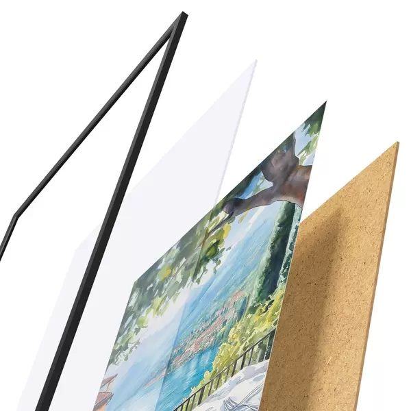 Das Poster besteht aus einem Rahmen, Plexiglas, einem gedruckten Bild und einer Rückwand aus Spanplatten. Dank der Halterungen auf der Rückseite kann das Poster sofort an die Wand gehängt werden.