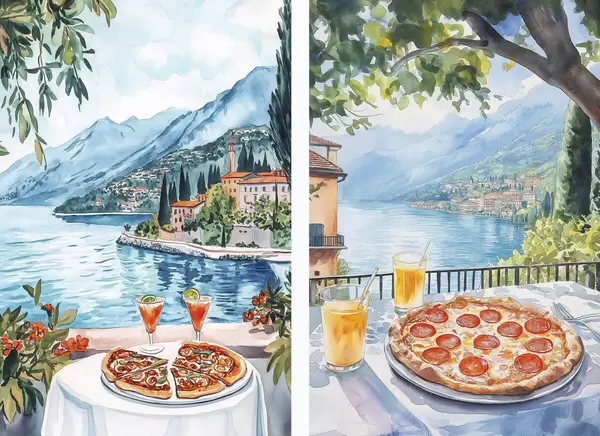 Poster Comer See, Brunch in Italien, Aquarellstil, Pizza Margarita, Sommer Natur Nr d00406